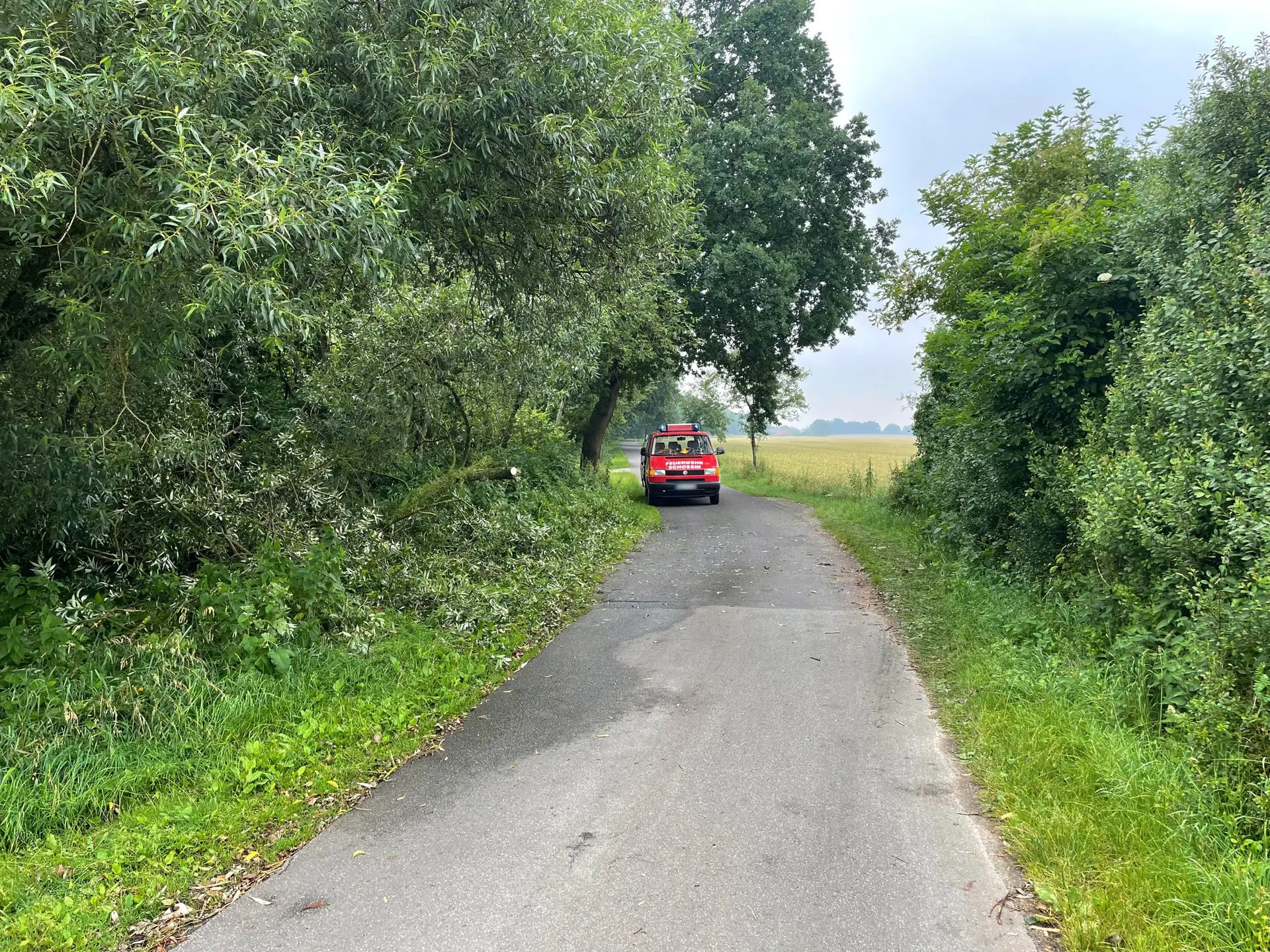 Mit dem vollbesetzten TSF ist die Feuerwehr Schossin zur Einsatzstelle gefahren und hat einen schweren Ast von der Straße entfernt.